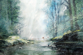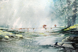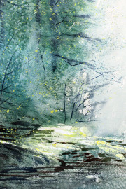 Paesaggio fluviale, acquarello su carta, cm 50x76, entro cornice.