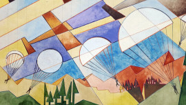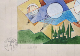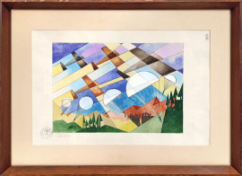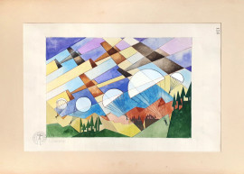 Aeropittura, tempera e tecnica mista su foglio protocollo del maestro Vittorio Caproni, cm 23x36, firma titolo e timbro in basso a sinistra, entro cornice