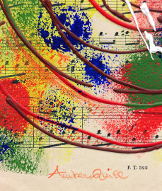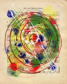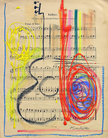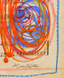 Composizione astratta con chitarra e Composizione astratta con vortice, lotto composto da due tecniche miste su spartito musicale, ciascuna cm 33x26, firmate e corredate di autentica