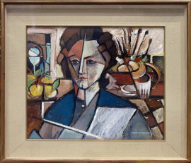 Composizione cubo futurista, tecnica mista su tela applicata su tavola, cm 34x39, firmato in caratteri cirillici in basso a destra, entro cornice
