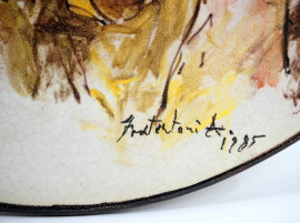 Coppia di piatti da muro in ceramica dipinta a soggetto di figure, firmati e datati, diam. cm 43