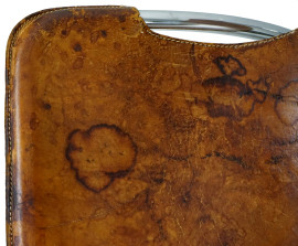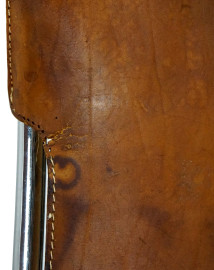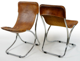 Coppia di sedie di design, anni '70, struttura in metallo cromato, sedute in cuoio, cm 81x52x43, (difetti, macchie)