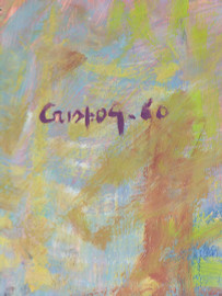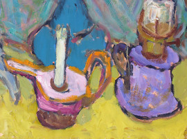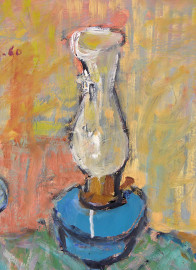 Gianni Crispo (1931-2006), Composizione con lampade a petrolio e candela, 1960, olio su carta, cm 67x48, firmato e datato in alto a sinistra. L’opera è dipinta sul retro di un manifesto vintage della Shell