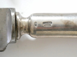 Grande coltello e forchettone da portata con manici in argento e lama inox, manifattura Calderoni Milano, cm 29 e 32