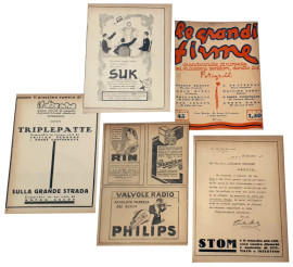 Lotto composto da cinque locandine dei primi del Novecento con stampa fronte e retro di pubblicità d’epoca, ciascuna circa cm 24x18