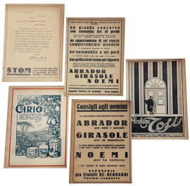 Lotto composto da cinque locandine dei primi del Novecento con stampa fronte e retro di pubblicità d’epoca, ciascuna circa cm 24x18