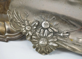 Lotto composto da uno svuotatasche e due vassoi in metallo argentato, decori incisi, misure max cm 3,5x47x33, XX secolo, (segni del tempo)
