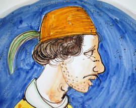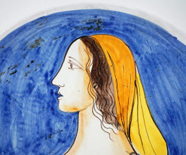 Lotto di cinque piatti in ceramica dipinta, decori raffiguranti soggetti diversi, diam max cm 42,5
