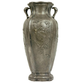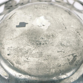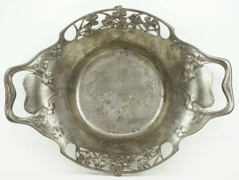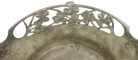 Lotto di tre oggetti in peltro, composto da un vasetto, una salsiera ed un centrotavola liberty, alt. max cm 18,5, (segni del tempo).