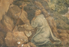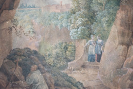 Paesaggio con figure all'eremo, acquarello su carta, cm 19x22, XIX secolo