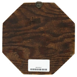 Placca in ottone raffigurante veliero, XX secolo, cm 14x15, montata su pannello ottagonale in legno
