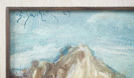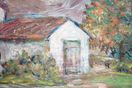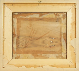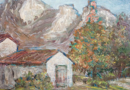 Paesaggio montano con case, olio su tavola, cm 30x35, entro cornice