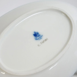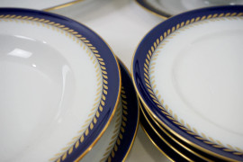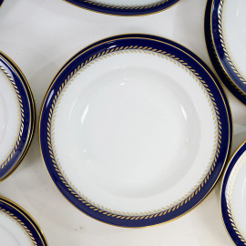 Servizio da tavola Royal Tettau, XX secolo, in porcellana bianca con profilature blu e dorate (pz. 59), misure max cm 13,5x33x27.