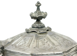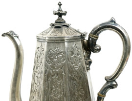 Servizio da thè e caffè in metallo argentato, Inghilterra, inizi XX secolo, composto da teiera, caffettiera, zuccheriera e lattiera, decori incisi, alt. max cm 26, (difetti sotto la base)