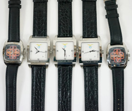 SS Lazio ed AS Roma, lotto di sei orologi da polso da uomo, cinturino nero in cuoio, lunghezza cm 24,5, (segni di utilizzo, meccanismo da revisionare).