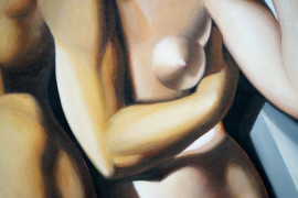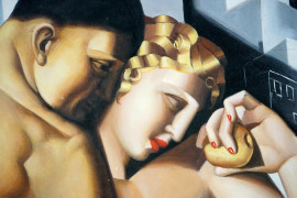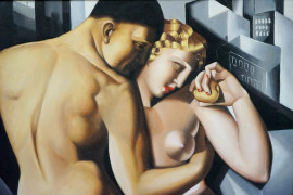 Tamara De Lempicka (1898-1980) omaggio a, Amanti, olio su tela, cm 70,5x50, entro cornice.