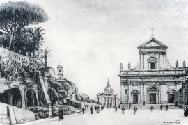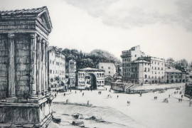 Tre stampe di Antonio Carbonati (1893-1956) raffiguranti monumenti di Roma, cm 22x33, entro cornici