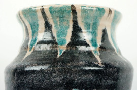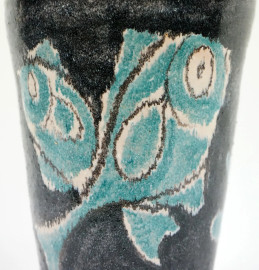 Vaso in ceramica smaltata raffifgurante pesci nei toni dell'azzurro, cm h 24, firma della manifattura alla base, (segni del tempo).
