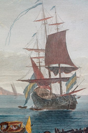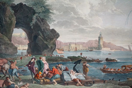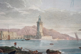 Veduta di Posillipo, stampa acquerellata, cm 57,5x77,5, da Joseph Vernet (1714–1789) e Robert Daudet (1737–1824), XX secolo, entro cornice.