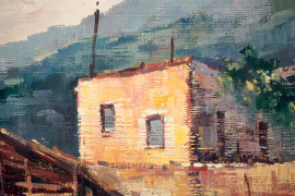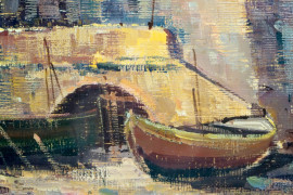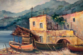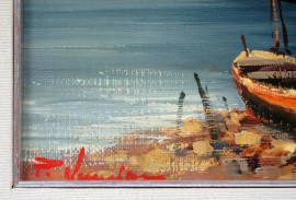 Costa con imbarcazioni, olio su cartone, cm 32x58, entro cornice