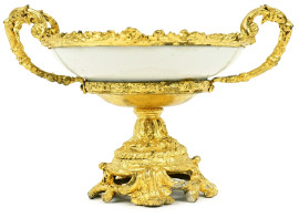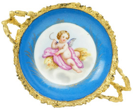 Alzatina in porcellana policroma e metallo dorato, Francia, XX secolo, coppa decorata con Allegoria dell'Estate, cm h 12,5