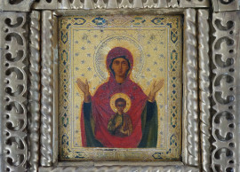 Antica icona raffigurante Madonna del Segno, tempera su tavola a fondo oro, cm 25x21, circa, entro teca con cornice in legno traforato e dorato, ingombro totale cm 11,5x58x42, (difetti e restauri).