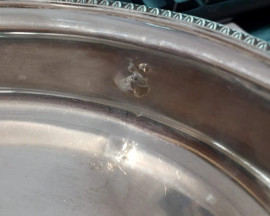 Antico vassoio in argento 800, cm 28x21x6, peso gr. 533, (un difetto).