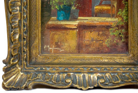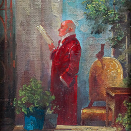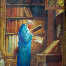 Aristocratici in lettura, due dipinti ad olio su cartone telato, cm 24x12, firmati, entro cornici.
