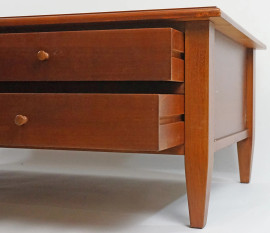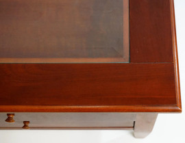 Basso tavolo bacheca in noce, XX secolo, piano in vetro, due cassetti sottopiano, cm h 46x130x70