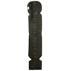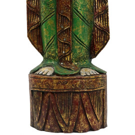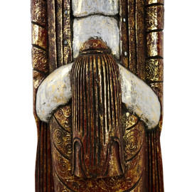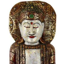 Buddha, scultura in legno intagliato, dorato e dipinto con applicazioni, cm h 161x39,5, arte orientale, XX secolo.