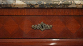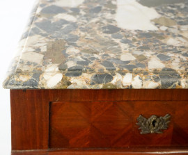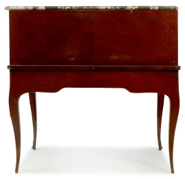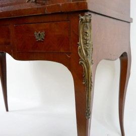 Bureau francese lastronato a marqueterie, inizi XX secolo, piano in marmo, fronte a tre cassetti, con rullo scorrevole celante quattro cassettini e vano centrale a giorno, piano interno in pelle, quattro gambe mosse, applicazioni boccachiavi e scarpette in bronzo, cm h 115x115x60, (difetti)