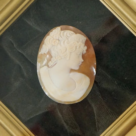 Cammeo raffigurante profilo di femminile, cm 5x4,5, inizi XX secolo, entro cornice ottagonale, ingombro tot cm 6x22.