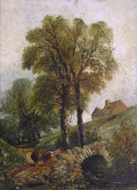 Charles Francois Daubigny (1817-1878) e Scuola di Barbizon, Paesaggio con alberi e armenti su ponticello, olio su tavola, cm 50x37, entro cornice.