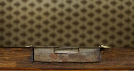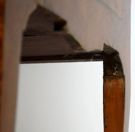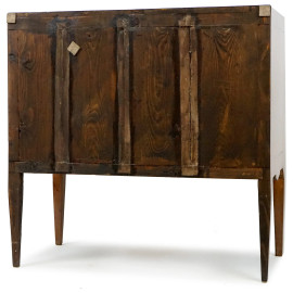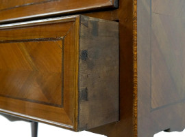 Comò in legno impiallacciato, XIX secolo, a due cassetti, quattro gambe troncopiramidali, cm h 81x82,5x40,5, (segni del tempo).