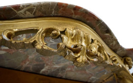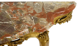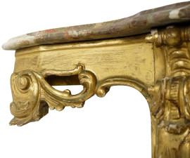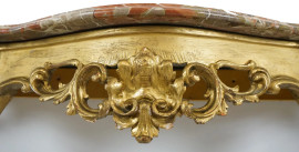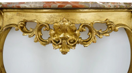 Consolle in legno scolpito e dorato, piano in marmo, fascia e gambe mosse con raccordo in basso a volute e foglia d'acanto, cm h 95x96x34, (difetti)