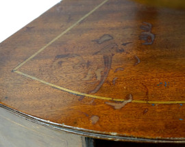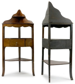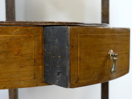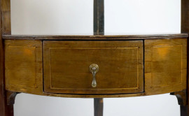 Coppia di angoliere in mogano con filettature in bosso, fine XIX secolo, ad un cassetto e quattro piani a giorno, cm h 120x40, (difetti)