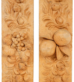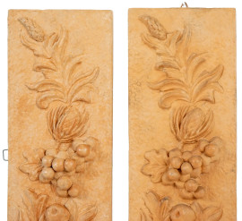 Coppia di fregi in terracotta con decoro ad altorilievo a grappoli d'uva, limoni e foglie, cm 71,5x12,5, XX secolo, (difetti).