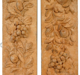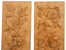 Coppia di fregi in terracotta con decoro di frutti a altorilievo, cm 42x12,5, XX secolo, (difetti).