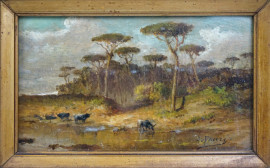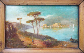 Coppia di paesaggi, olio su tavola, cm 11x18, di cui uno firmato, entro cornici