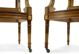 Coppia di poltrone stile Luigi XVI Francia, fine XIX-inizi XX secolo, in noce, parti scolpite e parzialmente dorate, gambe anteriori complete di rotelle, cm h 102x62x56, (difetti, mancanti sedute)