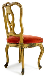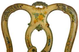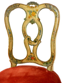 Coppia di seggiole in legno laccato e dipinto, Veneto, XVIII secolo, schienali a giorno, sedute rivestite in velluto rosso, quattro gambe mosse, decori dipinti in policromia a motivi floreali, cm h 93, (difetti)