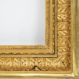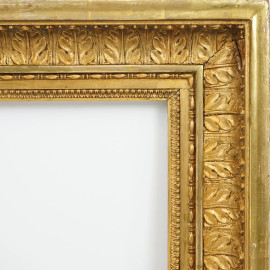 Cornice a guantiera in legno dorato e intagliato a palmette in sequenza, inizi XIX secolo, misure ingombro cm 77,5x60, misure luce cm 60,5x43,5, (difetti).