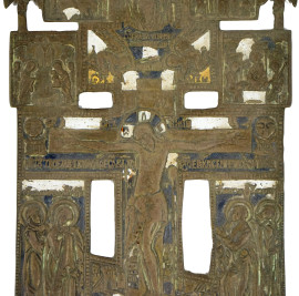 Croce ortodossa in bronzo e smalti policromi, con scene della vita di Cristo, XIX secolo, cm 22,7x12,5, (lievi difetti)
