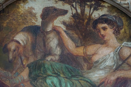 Diana cacciatrice, olio su tavola ad assetto ovale, cm 25,5x30,5, prima metà XX secolo, entro cornice.