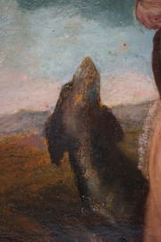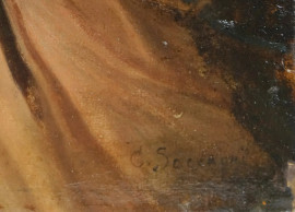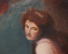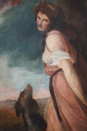 Fanciulla con cane, olio su carta applicata su cartone, cm 34x26, firmato, entro cornice.