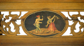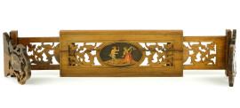 Fermalibri sorrentino in legno intarsiato ed intagliato, con tarsie dipinte a mano raffiguranti la tarantella, cm 10x40x10, XX secolo, (segni del tempo).