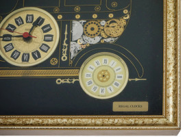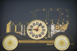 Fiat- Regal Clocks, orologio con vari componenti assemblati a forma di macchina, quadranti a numeri romani, ingombro tot cm 4,5x30x38,5, (meccanismo da revisionare).