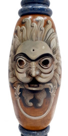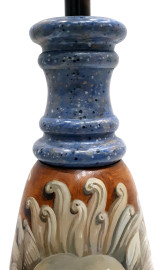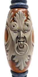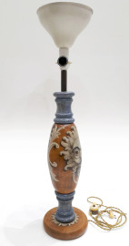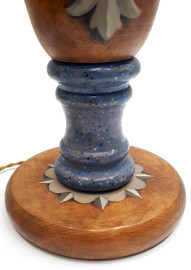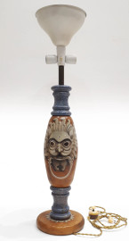 Grande lampada da tavolo in legno tornito finemente dipinta a mano a motivi di mascheroni e finto marmo, altezza cm 100
