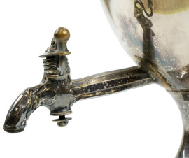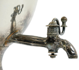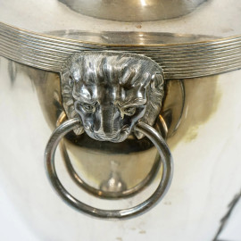 Grande samovar ad urna in metallo argentato, fine XIX-inizi XX secolo, prese laterali a protomi leonine, poggiante su base quadrata sorretta da quattro piedini sferici, cm h 54, (difetti)