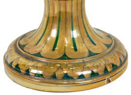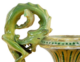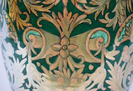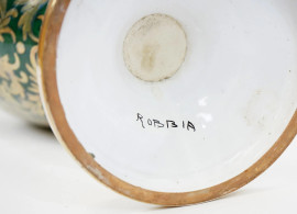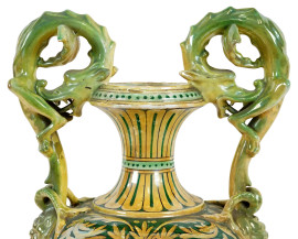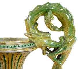 Grande vaso biansato Robbia Gualdo Tadino, XX secolo, in ceramica a lustro con decori a grottesche dorate su fondo verde, anse a forma di animali mitologici, cm h 70, (difetti)